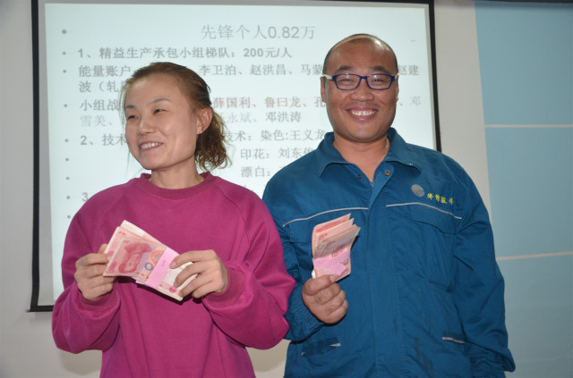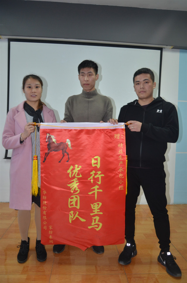 今年6月-10月,家紡車間精益生產小組成員標準操作能量值匯總排名前10位的員工是:340絲光精益生產小組朱兵兵以1585分排名首位,以下依次為:特整精益生產小組楊猛、定型整理精益生產小組趙洪昌、冷染精益生產小組陳長興、340絲光精益生產小組孔慶凡、冷染精益生產小組王士波、320拉幅精益生產小組劉曉斐、320拉幅精益生產小組馬蒙蒙、360定型拉幅機李奎、340絲光精益生產小組李海通。10月份精益生產小組(戰隊)前三甲為:360拉幅精益生產小組、320拉幅精益生產小組、印花精益生產小組。質量完成好生產小組是:卷烘精益生產承包小組、印制精益生產承包小組、軋染精益生產承包小組和翻縫精益生產承包小組。340絲光機傘柄箱改造、燒毛機濾芯防護、軋光機尼龍輥處加照明、執行管理標準化看板創新等四項提案,為10月份優秀提案;“烽火狼戰隊”340絲光精益生產承包小組榮膺紅色千里馬錦旗,同時獲得每人2000元、小組總計10000元的獎金,另有四個小組分別獲得8000元、6000元、4000元、3000元不等的獎金;“質量先鋒”卜程程、藺春嶺各獲2000元獎金。