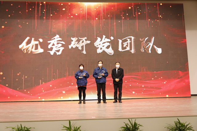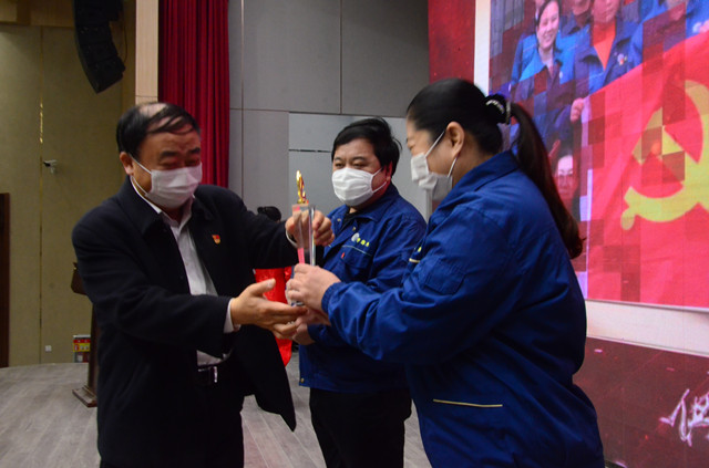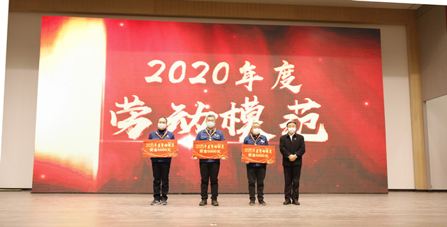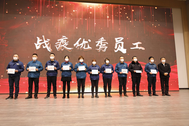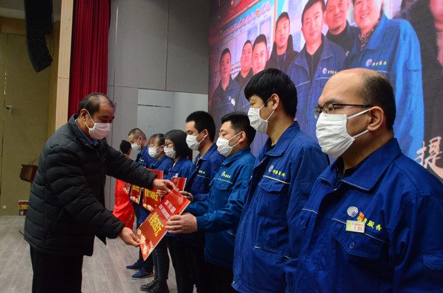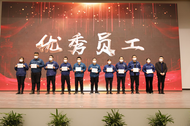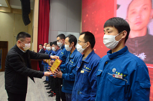 1月16日,公司在嚴格規范疫情防控前提下,在公司新近啟用的會議中心舉行了年度持續深化精益生產總結會議。會上,公司黨委書記、董事長王力民為2020年度優秀黨支部、優秀團隊、優秀研發團隊、勞動模范、戰疫優秀員工代表頒獎;總經理閆英山為“華紡工匠”、十佳精益輪班(工段)長、十佳精益技術人員、十佳精益操作能手、優秀員工代表頒獎;副總經理李風明為優秀CQI項目、創新攻關項目、優秀精益機組頒獎。王力民做了題為《同心同德  繼往開來》的年度工作報告。會議由公司團委書記陳冰主持。