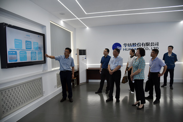 曹學(xué)軍一行先后參觀了花布車間、綜合辦公區(qū)、家紡展廳、研發(fā)創(chuàng)意中心、工程技術(shù)研究院、智云中心等部門和區(qū)域,并聽取了公司推進智能綠色工廠建設(shè)情況的匯報。