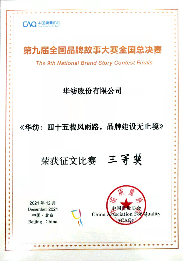 日前,第九屆全國(guó)品牌故事大賽落下帷幕,各獎(jiǎng)項(xiàng)均有歸屬。公司文化中心陳光娥撰寫的征文作品《華紡:四十五載風(fēng)雨路,品牌建設(shè)無(wú)止境》榮獲三等獎(jiǎng)。