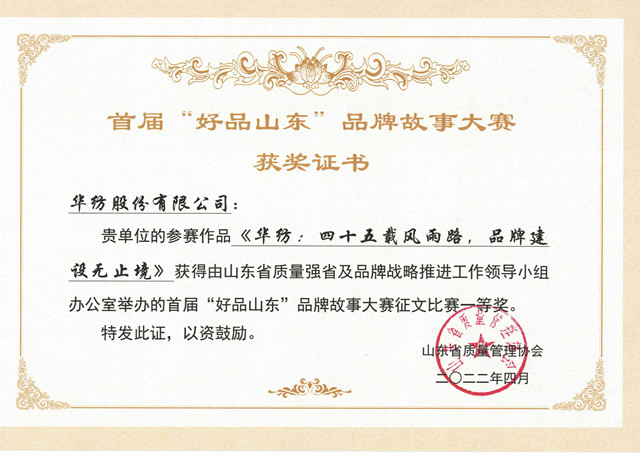 首屆“好品山東”品牌故事大賽結果日前公布,華紡股份有限公司文化中心陳光娥撰寫的征文作品《華紡:四十五載風雨路,品牌建設無止境》榮獲一等獎。