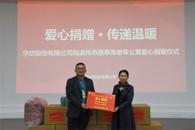 11月4日,公司舉行向?yàn)I州市頤壽苑老年公寓捐贈(zèng)愛心物資的活動(dòng)儀式。家紡分公司副總經(jīng)理曲偉華、濱州市頤壽苑老年公寓院長(zhǎng)鄢桂珍等參加了捐贈(zèng)儀式。