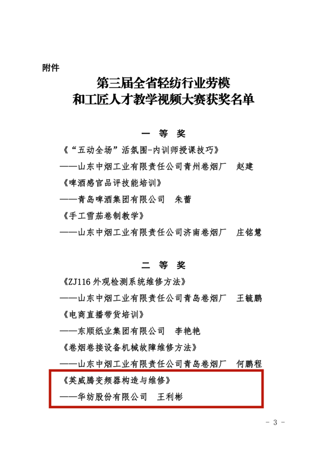 近日,由山東省輕工紡織工會組織舉辦的第三屆全省輕紡行業勞模和工匠人才教學視頻大賽評比結果揭曉,公司電氣自動化車間硬件技術員王利彬的《英威騰變頻器構造與維修》教學視頻榮獲二等獎、公司電氣副總工、電氣自動化車間主任趙奇生的《10KV電力變壓器檢修停送電操作流程》教學視頻喜獲大賽優秀獎。