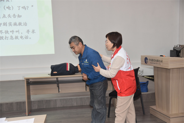 培訓課上,王燕老師首先介紹了紅十字運動的基本知識,隨后重點針對日常生活中較為常見的意外事故,向在場員工詳細講解,并演示了創傷救護、氣道異物梗阻急救、海姆立克急救法、心肺復蘇及包扎固定等急救技能和相關知識。