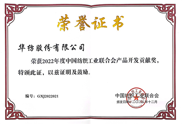 近日,中國紡織工業聯合會發布《關于授予2022年度中國紡織工業聯合會產品開發貢獻獎等榮譽稱號的決定》,公司獲評“2022年度中國紡織工業聯合會產品開發貢獻獎”榮譽稱號。