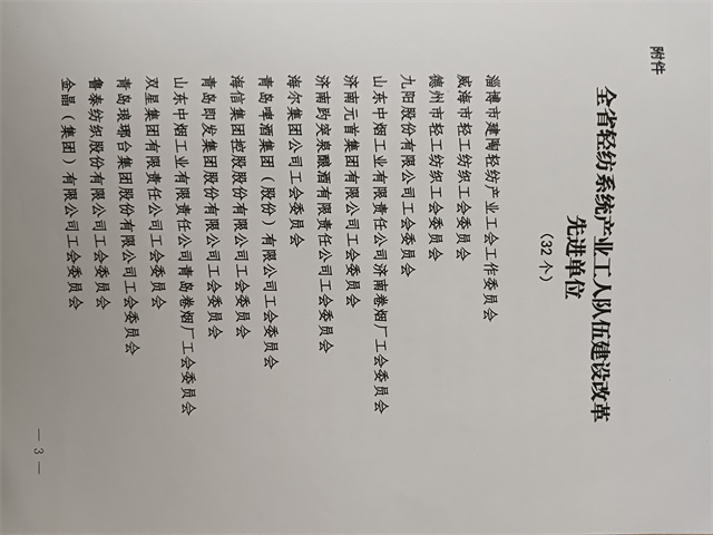 近日,省輕工紡織工會三屆四次全委會暨全省輕紡系統(tǒng)產(chǎn)業(yè)工人隊伍建設(shè)改革推進(jìn)會議在濟(jì)南召開。會上公布了全省輕紡系統(tǒng)產(chǎn)業(yè)工人隊伍建設(shè)改革先進(jìn)單位名單,公司工會委員會名列其中。