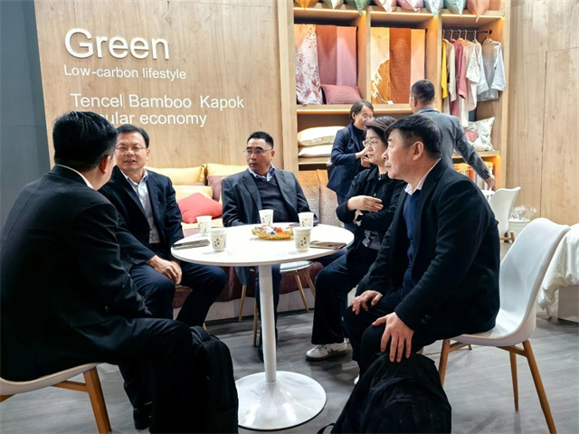 此屆法蘭克福家紡展,華紡股份家紡分公司打造了以“Green world”為主題,以綠色環保可持續的特色纖維產品為主材質,研發了醋酸系列/真橙系列/木棉系列/絲質系列/超柔系列/麻系列六大系列產品,從材質、功能、膚感、科技、花型、款式等多方面對產品進行了融合升級,吸引了來自法國、意大利、葡萄牙等諸多國家的客戶進入展位進行咨詢洽談!其中,迎合歐洲市場喜好的亞麻、漢麻提花、色織簡約條紋產品也成功吸引了來自歐美的客戶。