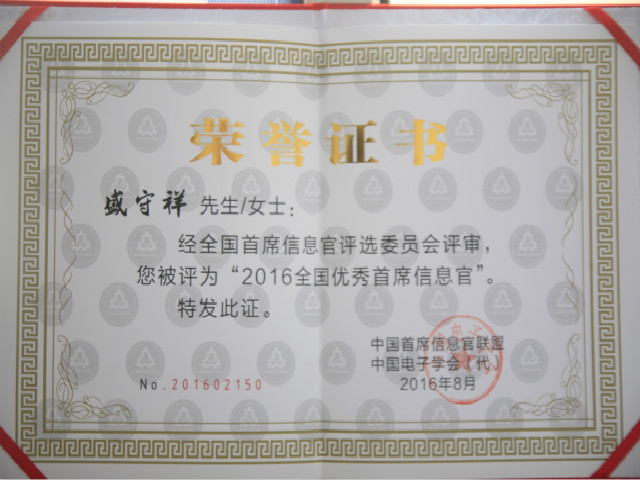 導讀:日前,中國首席信息官聯盟、中國電子學會對2016年度全國優秀首席信息官評審結果進行了表彰,公司副總經理盛守祥以在推進數字華紡智慧華紡建設方面的卓異業績,獲得這一殊榮。