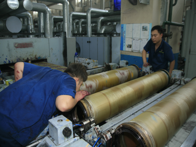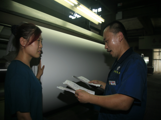 花一車間后處理技術員張延軍(圖右)與軋光機機長吳秀祝在交流生產(chǎn)情況。他倆表示,每一米優(yōu)質(zhì)產(chǎn)品都是靠專注認真干出來的。
